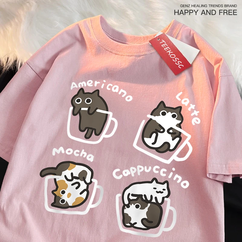 American Style Coffee Cat Japanese Style Tshirts Man Casual Breathable Cotton Loose Summer T-Shirt Loose Cotton Oversize T Shirt