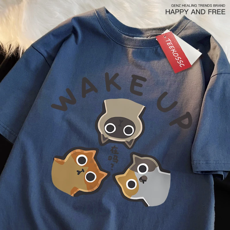 Wake Up 3 Onlookers Of Cats Japanese Style Menswear Cotton Tee Clothes T-Shirts Oversized Quality Shirts Fashion Crewneck Tshirt
